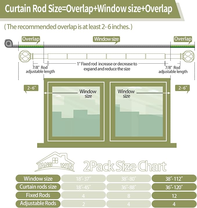 - 2 Pack Curtain Rods for Windows 66 to 120 inch(5.5-10ft): TANGWIN gold drapery rods include 12 x 16" x 1" fixed rods, 4 x 16" x 7/8" adjustable rods, 4 x finial, 6 x bracket, 10 x connector, 12 x anchor, 12 x screw. 2 Pack gold curtain rods for windows can extend from 36 to 120 inches, choose the right size curtain rods according to the length of your window.