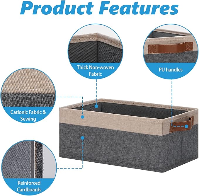 - 👍【QUALITY MATERIAL】Storage baskets for shelves are made of high-quality cationic fabric and polyester cotton fabric, and the inner layer is made of non-woven fabric, which is odorless, durable and strong. Classic faux leather handles that adds a comfortable touch and provides a strong and comfort grip to pull and move. Fabric storage bins are easy to clean, just wipe with a damp sponge or cloth.