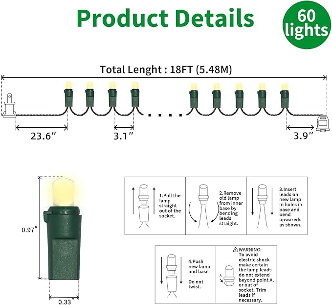 - 5mm LED Christmas Lights: 60 counts warm white 5mm wide angle stable LED string lights spaced 3.1 inches apart with green wire. 23.6 inch leads have a stackable male plug and 3.9 inch tails have a female plug for easy end to end connection.