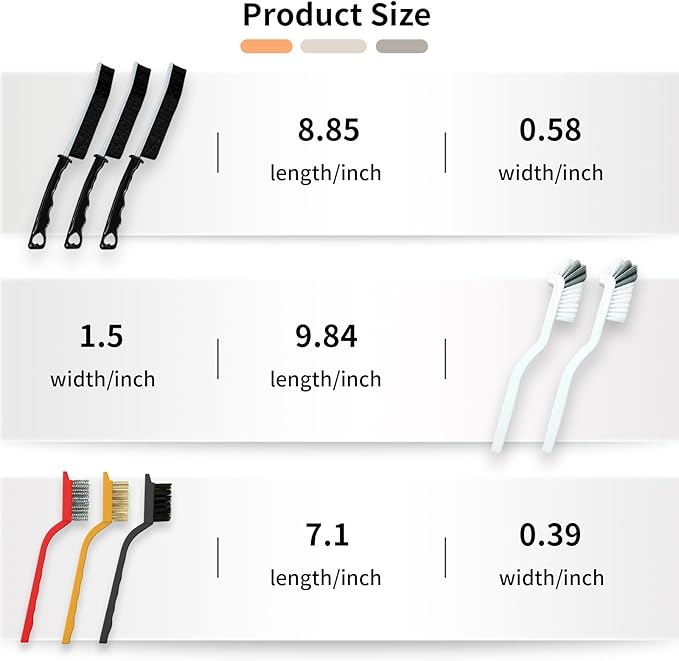 - 【8 Piece Ultimate Crevice Cleaning Brush Set】 Tackle every corner of your home effortlessly with our versatile cleaning brush kit! Includes 3 Crevice Brushes (ideal for narrow gaps and tight spaces), 2 Right-Angle Scrub Brushes (perfect for bottles, cups, and hard-to-reach interiors), 3 Wire Brushes (brass, steel, nylon) for tough cleaning tasks.