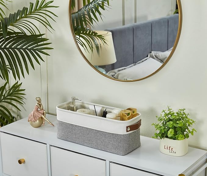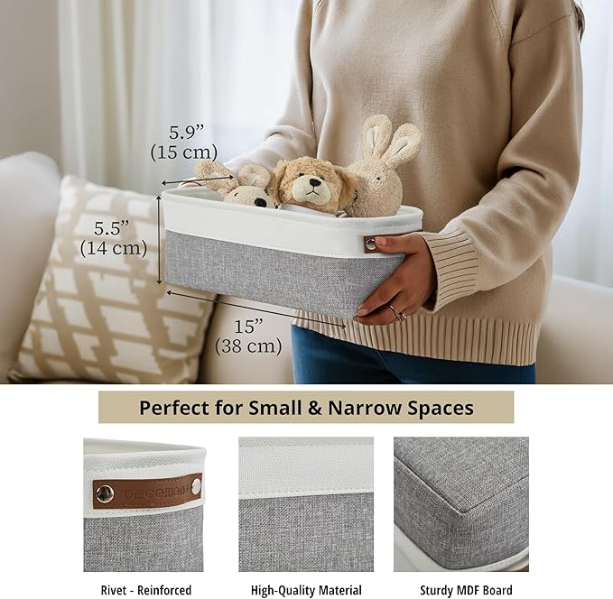 DECOMOMO Narrow Storage Bins Small Baskets for Organizing Bathroom, Toilet Tank, Towel Storage, Entryway, Gifts (Grey and White - Set of 4)