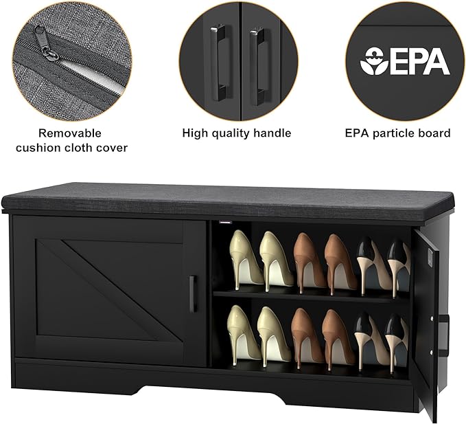 2-Tier Storage Bench, Shoe Bench with Padded Seat Cushion, Entryway Bench with 2 Barn Doors, Adjustable Shelf, 13.8" D x 39.4" W x 17.7" H, for Entryway, Living Room, Bedroom, Black