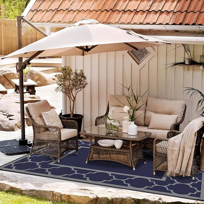 - Mood-Boosting Colors:Choose stain-resistant dark tones or go modern with blue & white or black. The reversible mat, with outdoor carpet qualities, is easy to clean and coordinates seamlessly with various decors. Whether placed on your deck or under a shaded umbrella, it serves as the perfect outdoor patio rug to match the style of your pamapic outdoor furniture.It’s an excellent piece for fall home decor or to use as a stylish outdoor rug fall accent