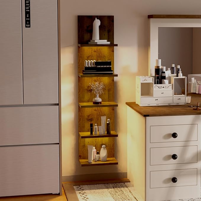 5 Tier Wall Shelf Unit, Modern Vertical Lack Wall Shelves with Light, Wall Mount, Floating Column Home Decor Shelves for Bedroom, Living Room, Vanity Storage Display(Dark Brown)
