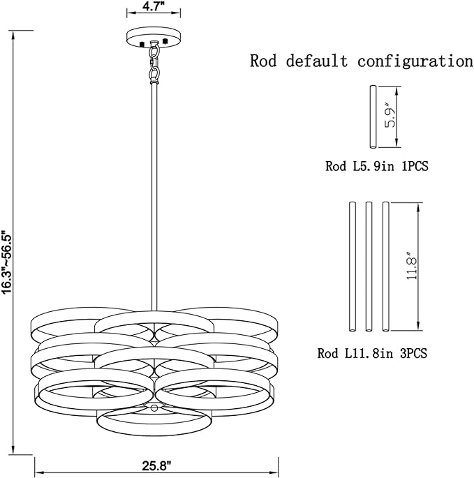 - Size & Widely Applications -- Diameter: 25.8in, Height: 16.3~56.5in. Canopy Diameter: 4.7 in. Comes with one 5.9" and three 11.8" downrods, so you can flexibly adjust the hanging height of the Industrial chandelier. Sloped ceiling adaptable.