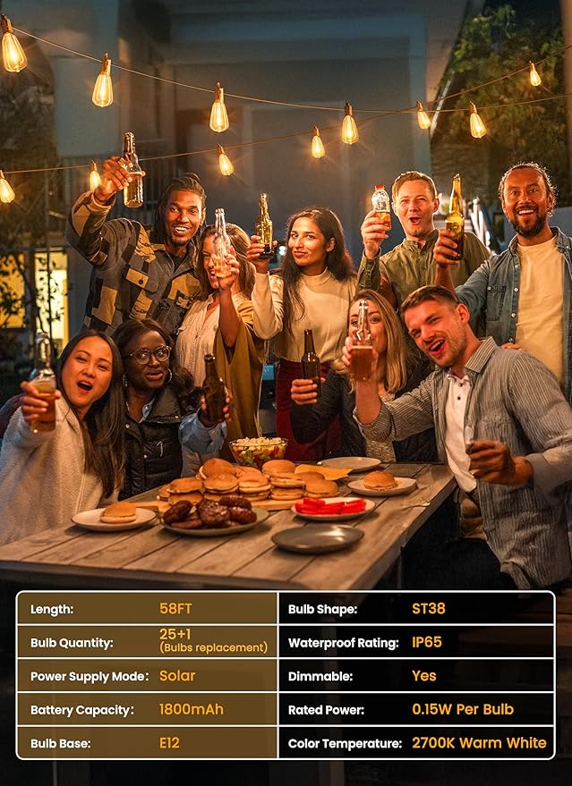 - 【Widely Used & Easy Installation】No outlet needed, you could put these solar Edison string lights anywhere you want; The solar panel can be staked into the ground or mounted on the wall, the outdoor solar lights are fabulous decorations to add relaxing and romantic ambiance for both indoor and outdoor spaces; With built-in hooks on the socket, you can set up these string lights and get your space dressed in a few minutes.