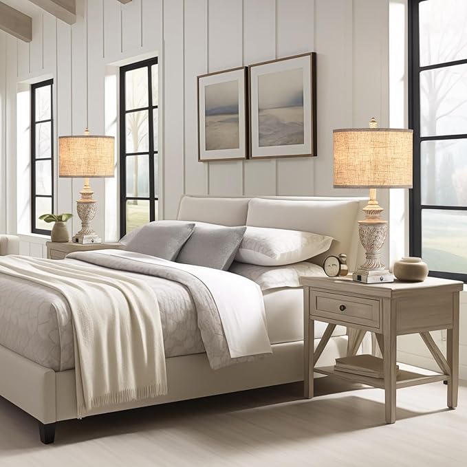 - 【RETRO FARMHOUSE RUSTIC TABLE LAMPS SET OF 2】This living room lamps set of 2 is hand-crafted oak's leafwork texture from vintage charm washed white resin, and this 27" tall table lamp is topped with an elegant oatmeal linen lampshade make the light bright enough without glare, which can effectively relieve eye fatigue and protect eyes. A decorative finial of farmhouse-style nightstand lamps set of 2 adds a aesthetic decor with beautiful soft ambient light to your living room, bedroom, office