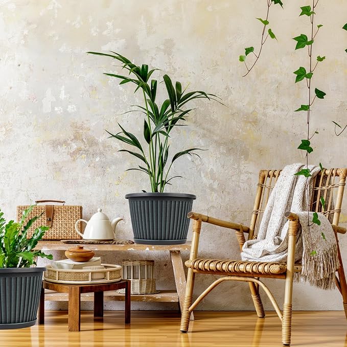 - 【Modern Style Planters】 Indoor planters with saucers provide a unique,nice style in ribbed design which gives an understated elegance that will enhance the beauty of your plant. These 10 inch plant pots are available in red-brown &blue-green & gold finished with a black antique stain. Plastic flower pots would be a beautiful addition to anyone’s deck or sunroom or house! for indoor and outdoor . With better breathabiity and water absorption, it’s beneficial to the healthy growth of plants