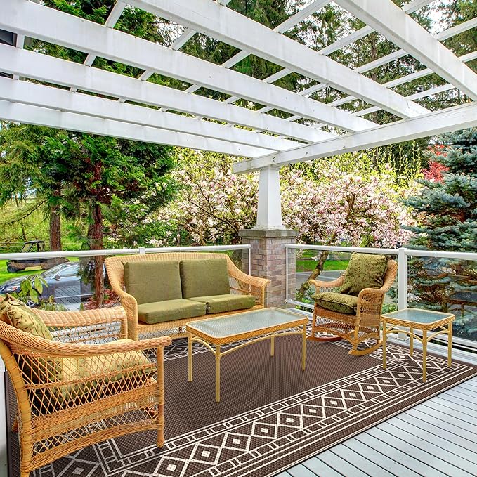 GENIMO Outdoor Rug Waterproof for Patio Decor, 5'x8' Reversible Plastic Straw Rug Carpet, Camping Mat for Outdoor, RV, Backyard, Deck, Balcony, Picnic, Beach, Coffee & Beige
