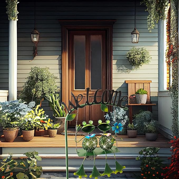 Frog Solar Light Garden Outdoor Decoration Swing Metal Stake Lamp with Welcome Sign Waterproof Patio Yard Decor Gifts-48 inch