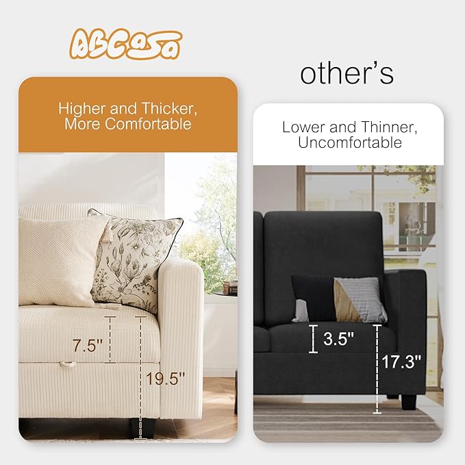 - ARMCHAIR WITH STORAGE:The modern accent chair has a hidden storage compartment large enough to hold blankets, books, cushions, CDs, or anything else you want to keep handy. This not only saves space but also helps keep your living room tidy. This multifunctional sofa can be easily rearranged to fit both small and spacious living rooms, bedrooms, playrooms, etc. Storage dimensions: 24.5''W x 25''D.