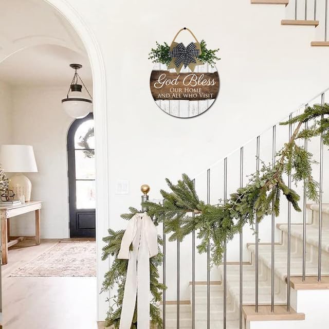 FemiaD God Bless This Home and All Who Enter Sign for Front Door Funny Wreaths Hanging Wooden Plaque Decoration Round Rustic Wood Farmhouse Porch Decor for Home Front Door Decor 11inch