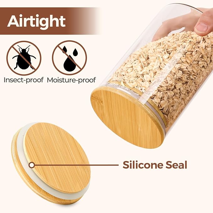 - Airtight Food Jar: The kitchen glass food storage containers use lids and all seal with a silicone sealing ring for a better airtight space to prevent the food from getting wet and gain longer freshness time and longer storage time