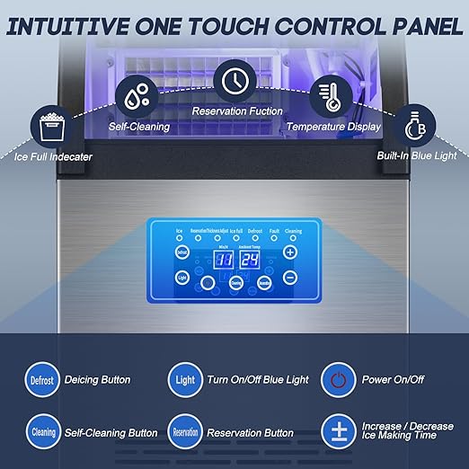 - 𝗠𝗨𝗟𝗧𝗜-𝗙𝗨𝗡𝗖𝗧𝗜𝗢𝗡𝗔𝗟 𝗟𝗖𝗗 𝗖𝗢𝗡𝗧𝗥𝗢𝗟 𝗣𝗔𝗡𝗘𝗟 - Our multi-functional ice cube maker is designed to provide convenience and ease of use. With a user-friendly LCD control panel, all the functions of the ice maker can be accessed and operated effortlessly with just a single click. Including 24-HOUR RESERVATION FUNCTION、AUTOMATIC SELF-CLEANING FUNCTION、MALFUNCTION REMINDERS、BUILT-IN BLUE LIGHT、DE-ICING FUNCTION and so on