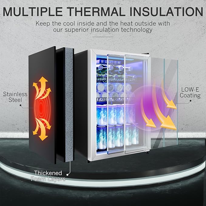 - [Refrigeration & Cooling Storage 2-in-1] I wanted to let you know that this wine cooler is pretty cool! It uses advanced air cooling technology that allows for 360° full-angle recirculated air duct cooling, which means that everything inside gets cooled evenly. Pretty neat, huh? You'll also appreciate the beautiful glass door with a low-e coating and a high density door seal that prevents cold air from escaping while blocking warm air from entering.
