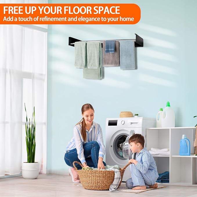 FOCHIER F Laundry Drying Rack Wall Mounted Clothes Drying Rack Collapsible with 5 Aluminum Rods and Drilling Template Long Screwdriver Bit 60 lbs Capacity (Black, 40")