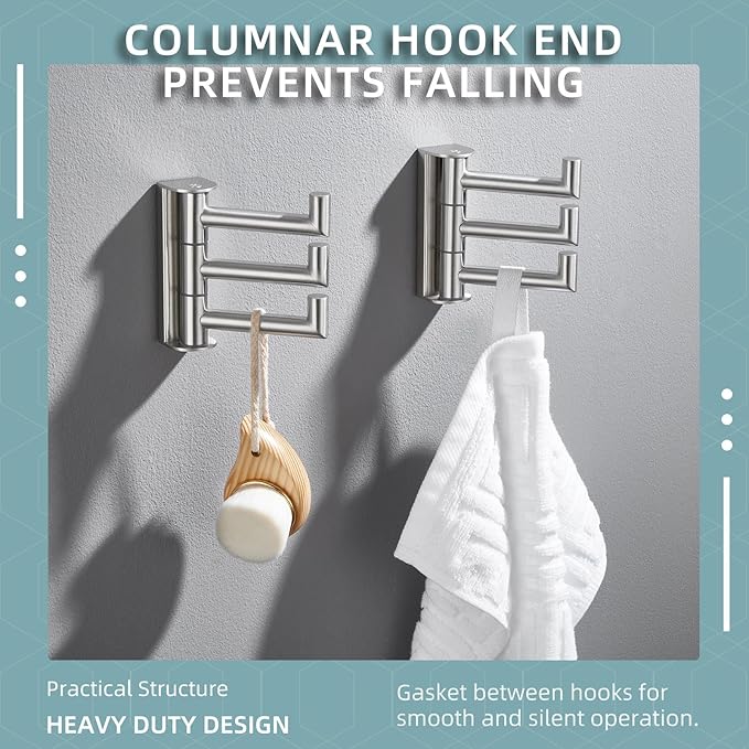Angle Simple Swivel Towel Hooks, SUS 304 Stainless Steel Foldable Robe Hand Towel Holder for Bathroom Kitchen Wall, Brushed Nickel, 2 Pack