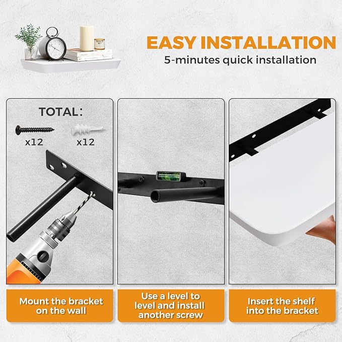 - Hidden Bracket Installation: Includes secure hidden steel brackets for a clean floating look. These easy-to-install shelves provide stability and a sleek, minimalist appearance