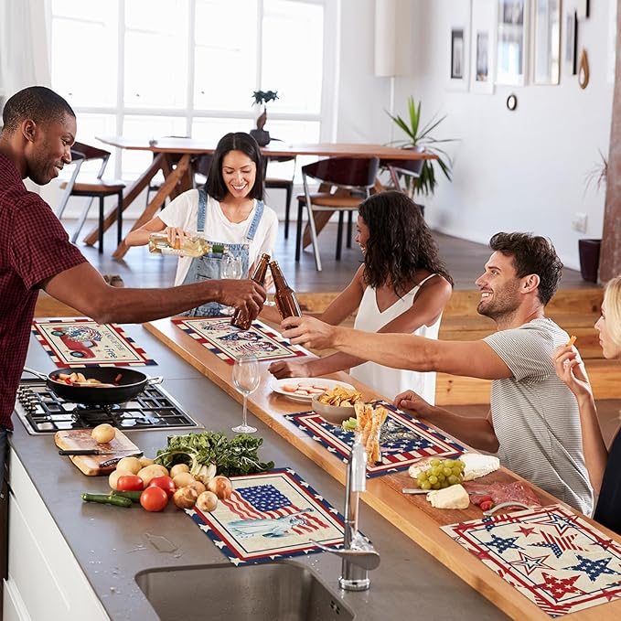 - Thoughtful design: 4th of july placemats set of 6, each with four rounded corners protects you from being hurt by the sharp angles. The design of the 4th of July plastic kitchen dining placemats feature the vintage design and printed with American flag, truck, gnomes and boots patterns. Impress your guests and create an unforgettable and warm atmosphere for your party.