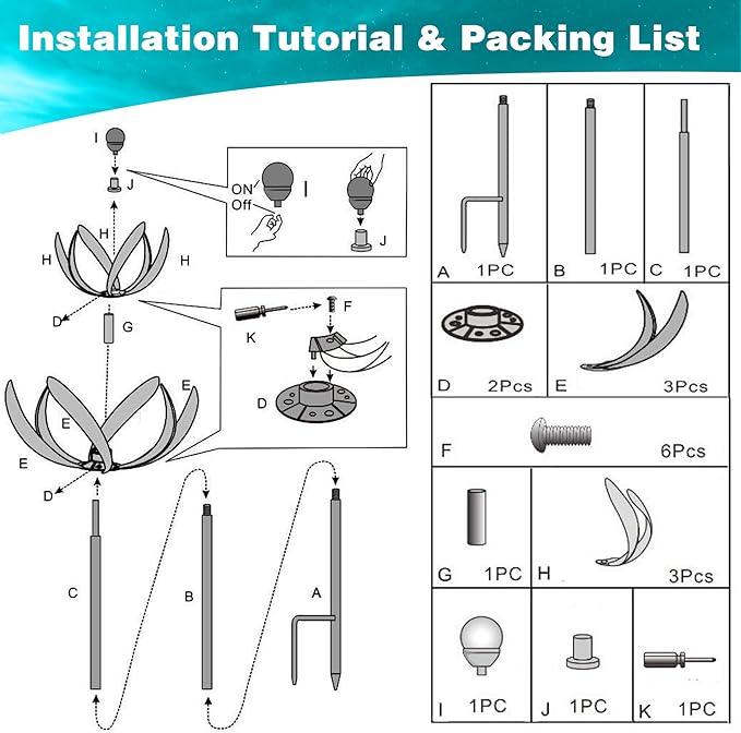 - Easy to Install: Large wind spinner is very easy to install, just twist all the accessories to install. The metal pole, the angle of the petals can be adjusted, you can also adjust the length of the pole and the degree of bloom of the flowers.