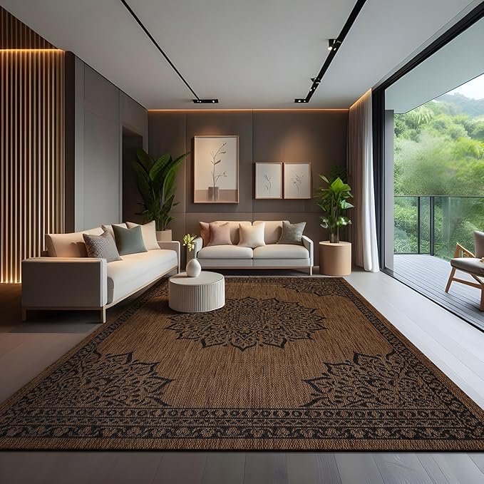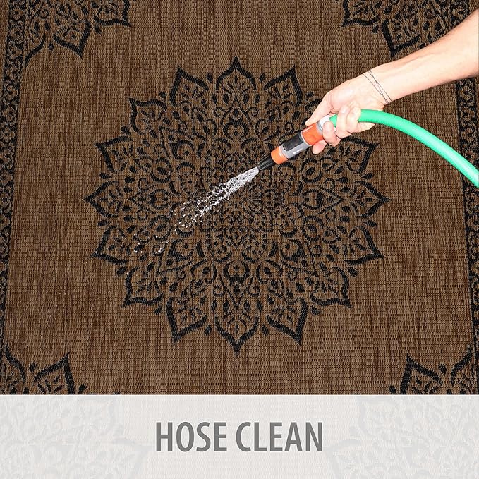 CAMILSON Outdoor Rug, 9x12 Medallion Nut Brown Black Modern Area Rugs for Large Indoor and Outdoor Patios, Kitchen and Hallway Mats, Washable Porch Deck Outside Carpet (Nut Brown Black, 9 x 12)