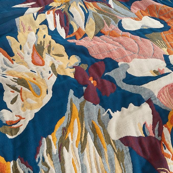 Boho Throw Blanket for Bed 80”x90”, 100% Cotton Woven Blanket for Couch Sofa, Ultra Soft 4-Layer Muslin Quilt with Vintage Floral Printed, Farmhouse Bed Blanket/Cover for Living Room Decor