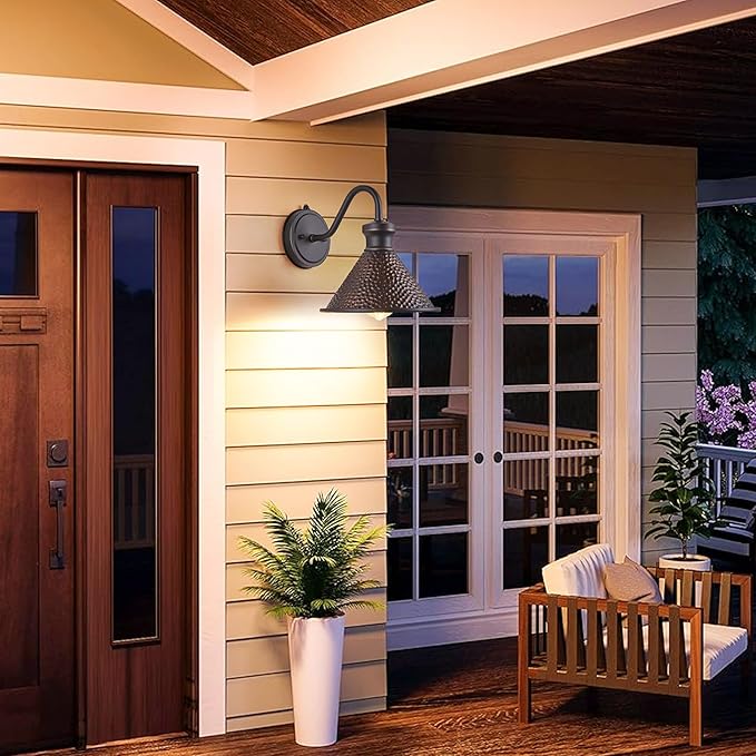 - 【Stylish Dark Skies Design】: This is a very stylish Dark Skies compliant light fixture.Connected to a round backplate by a gooseneck stem, the trendy hammered cast aluminum shade incorporates a modern feel to emphasize a perfect balance of cozy, functional and casual living.The objective of Dark Sky is to preserve and protect the nighttime environment along with our heritage of dark skies through quality outdoor lighting. These products are designed to minimize glare ,reduce light trespass and curb the effects of light pollution.Ideal for farmhouse architectural design styles.