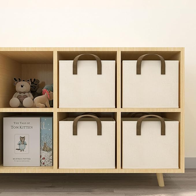 - 【Decorative Storage Bins for Closet with Handles】These cloth storage bins for closet organization are made with soft leather handles for easy carrying, and the neutral beige color shelf organizer bins are suitable for any room decor