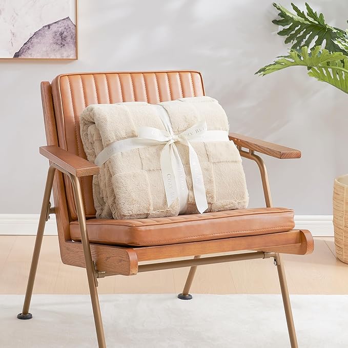 Cozy Bliss Tan Checkered Faux Rabbit Fur Throw Blanket, Soft Fuzzy Fluffy Minky Furry Blankets for Couch, Bed (50 * 60 Inches Beige)