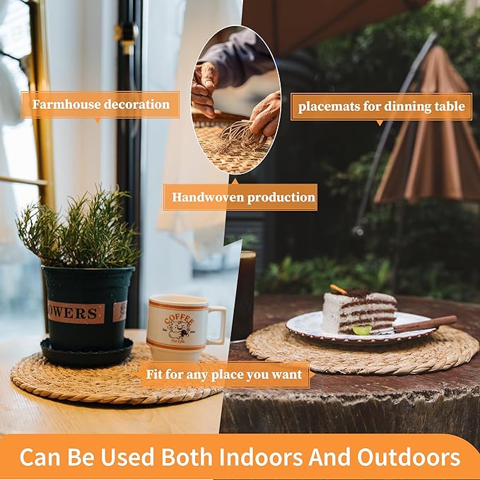 - Natural Pastoral Style】:The unique natural pastoral style is your first choice,our woven placemats are carefully handcrafted and made of natural 100% water hyacinth, Because this kind of grass grows on the water surface, the raw material itself will have some dried mold spots, but there are very few, which will not affect the use effect.