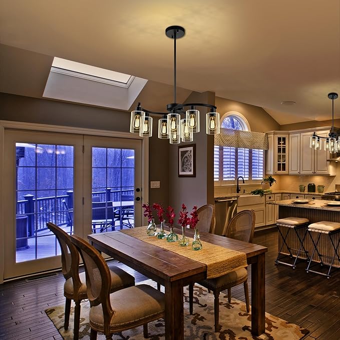 9-Light Black Modern Chandeliers for Dining Room, Adjustable Height Farmhouse Kitchen Island Lighting, Industrial Hanging Light Fixtures for Living Room Bedroom, Clear Glass Shade