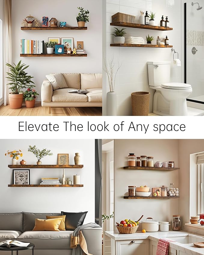 BAYKA Floating Shelves, 48 inches Long Wall Mounted Rustic Wood Shelves for Bathroom, Bedroom, Living Room, Kitchen, Office, Hanging Shelf for Books/Storage/Decor(Rustic Brown,Set of 2)