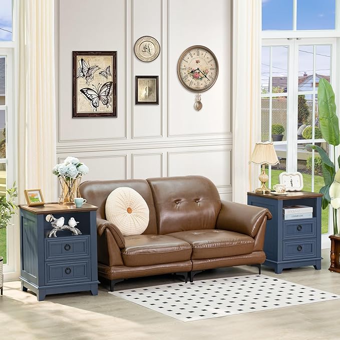 - [End Table with charging station] The side table with storage is equipped with 2 standard AC sockets and 2 USB ports. This tall nightstand provides great convenience when you use electronic devices, keeping your charging devices within reach. A 2.3-inch round hole is designed on the back to facilitate the arrangement of socket power cables and charging cables, making the desktop more tidy.