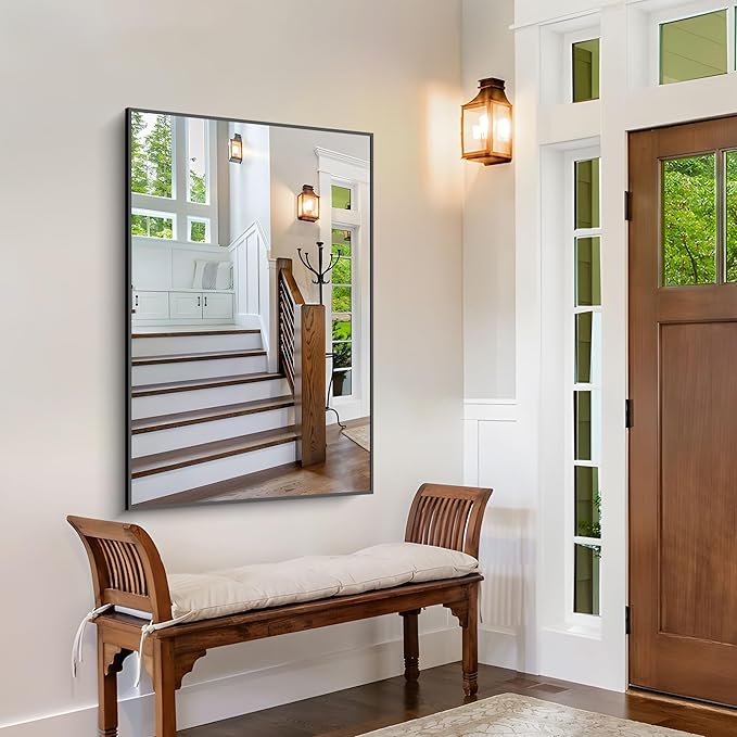 - MULTI-SCENES: Large bathroom mirror is the ideal size to place above the bathroom sink, thin frame will make your whole room unique and elegant, black bathroom mirror is a good choice to decorate your bedroom, living room, hair salon, etc.