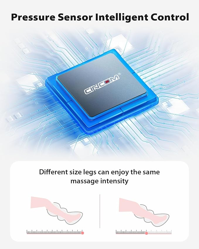 - Fit Most Legs - Featuring advanced pressure sensor technology, the CINCOM leg compression massager ensures that individuals with varying leg sizes can enjoy an equal massage intensity. The device accommodates calves up to 21" and feet up to 16.5".