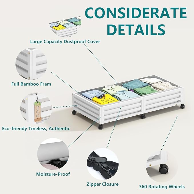 - š[Sturdy and Durable] Our under bed storage with wheels is crafted from premium wood bamboo, boasting 4 rotating wheels and a capacity of 120lbs. This 'under bed storage' solution includes non-woven bags for efficient organization of clothes, books, shoes, and toys.