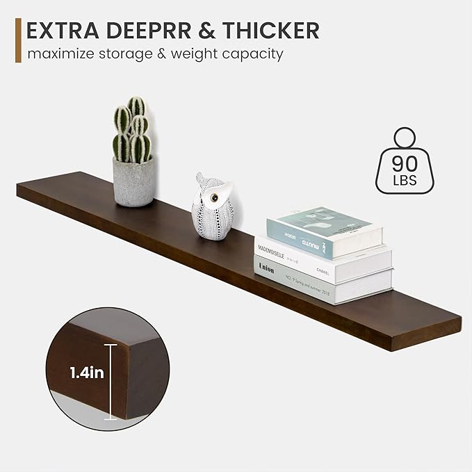 - Extra Deeper & Thicker for Storage - Each board measures 55"W x 8"D x 1.4"H. Extra deeper and thicker design in order to bring maximizes storage space and weight capacity, even hold up to 60 lb. This floating shelf taking up zero square feet, reduces clutter and highlights dΓ©cor in compact spaces. It can help make full use of the empty wall, making it much more space-saving and making your room look larger and tidier.