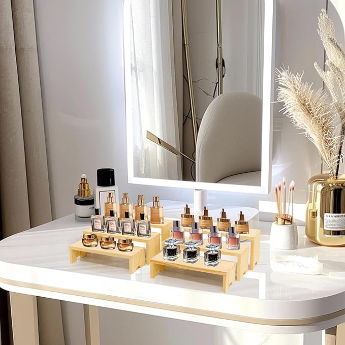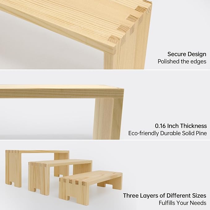 - 【Wooden Tierd Risers for Display】🎁: This 2 set 3 tier small display shelf for cupcakes or vendors has stackable nesting design, so the wooden display risers easily access as desktop storage racks,also they has strong load-bearing capacity for more kinds perfumes, collectible figures,kitchen condiment bottles, bathroom toiletries because of varieties size of (L7.8''/20cm-8.6''/22cm-9.4''/24cm)XW2.9'' /7.3cm