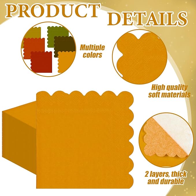 150 Pcs 5 x 5 Inches Fall Thanksgiving Paper Napkins Scalloped Cocktail Napkins Disposable Autumn Harvest Party Supplies Dessert Beverage Bathroom Table Dinner Wedding Decor