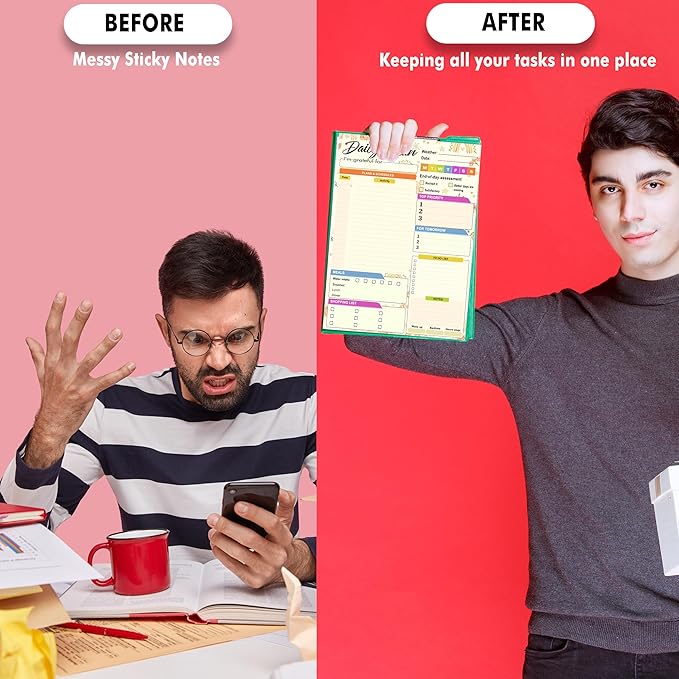 - š Daily task notebook Size & Thick Page : A spacious notepad, like our 8.5x11 inches format, provides ample room for jotting down your weekly tasks, goals, and notes. Thick 120gsm, using premium quality smooth white paper and High quality plastic front cover - a sturdy chipboard backing, high-quality paper is a game-changer when it comes to a weekly planner notepad. It prevents ink from bleeding through, ensures durability, and gives a substantial feel to your planner.