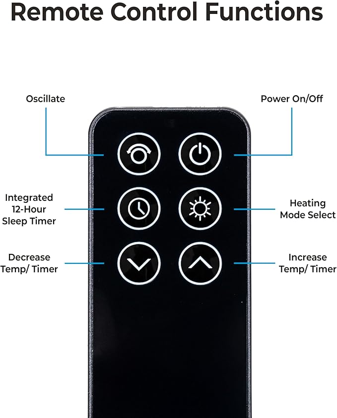 - DIGITAL PROGRAMMABLE THERMOSTAT: Set the temperature by pressing the arrows on the control panel or remote control, adjustable between 50°F and 90°F (10°C and 32°C). Once the desired temperature is set, the heater will stay on until the room temperature matches the digital display. It will then cycle on and off to maintain the desired temperature. Long press the arrows to continuously increase or decrease the temperature for easy adjustments.