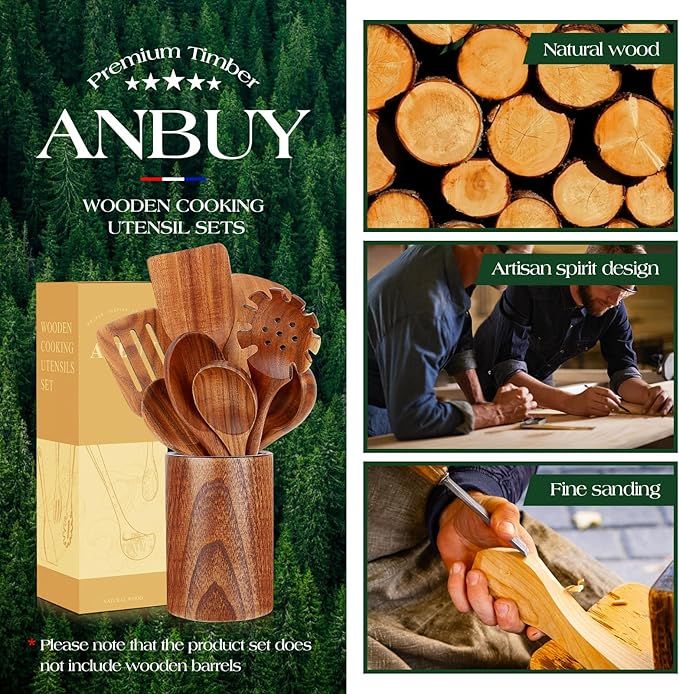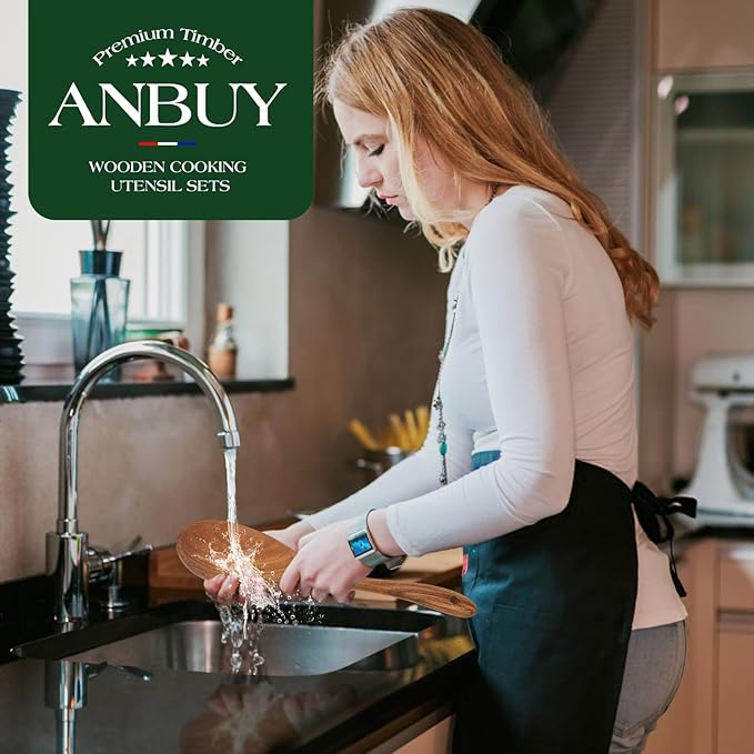 ANBUY Teak Wood Kitchen Utensils Set, Heat Resistant Wooden Spoons for Cooking, 10 Pcs Cooking Utensils Set Wooden, Wood Utensils Set for Cooking Food