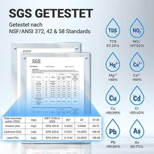 - 8 Stage Filtration: The reverse osmosis system features a 0.0001 μm membrane that effectively filters PFAS, heavy metals like lead, arsenic, and aluminum while the PCT filter enhances taste. This RO system is NSF/ANSI 58 certified for water assurance
