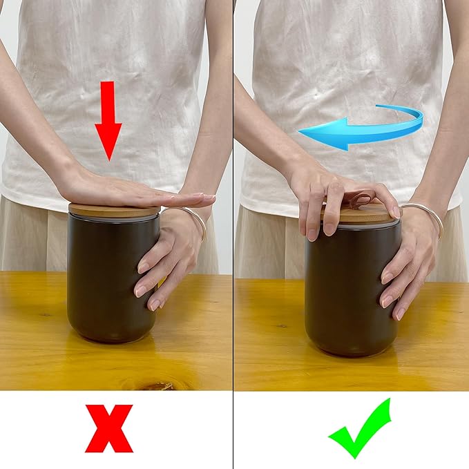- Easy to Refill & Clean: The wide-mouth design allows for quick scooping, refilling, or cleaning. The ceramic jar is dishwasher safe, while the bamboo lid must be hand washed and dried promptly. Tips; To ensure proper sealing, press the lid downward while twisting it at the same timeβdo not push it straight down without rotation.