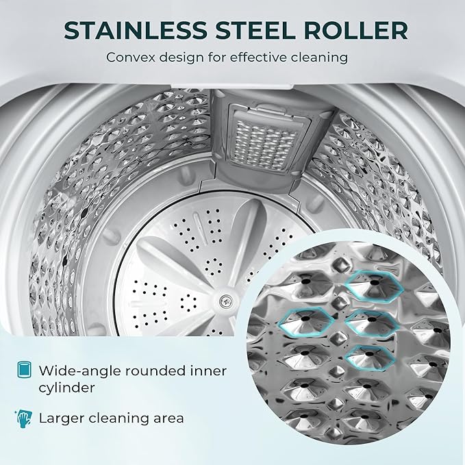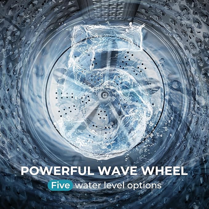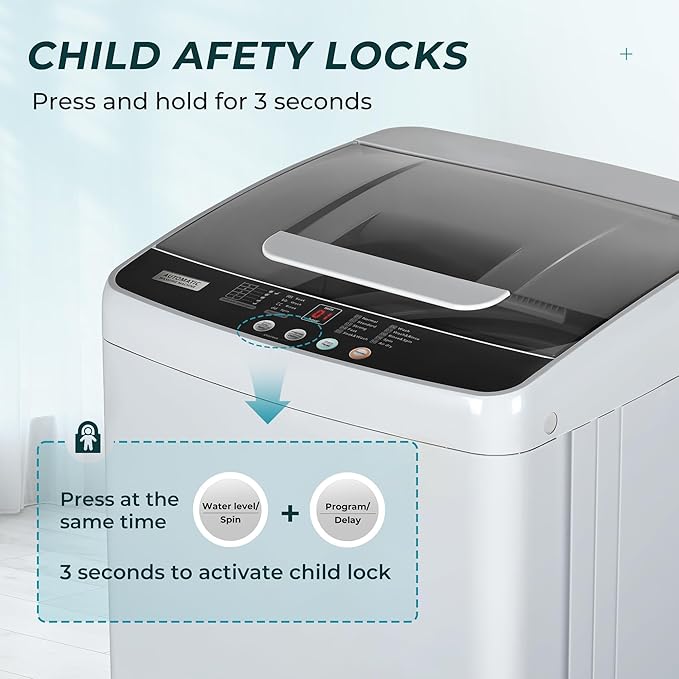 - More Thoughtful Design:Long press the "water level/spin" and "program/delay" buttons at the same time for 3 seconds to turn on the washing machine's child safety lock function,Then pressing other buttons doesn't respond. The non-slip feet of the compact washing machine can be adjusted for leveling, so that the washing machine can keep horizontal balance even on slightly inclined floors, and will not be easily tipped over by external forces.