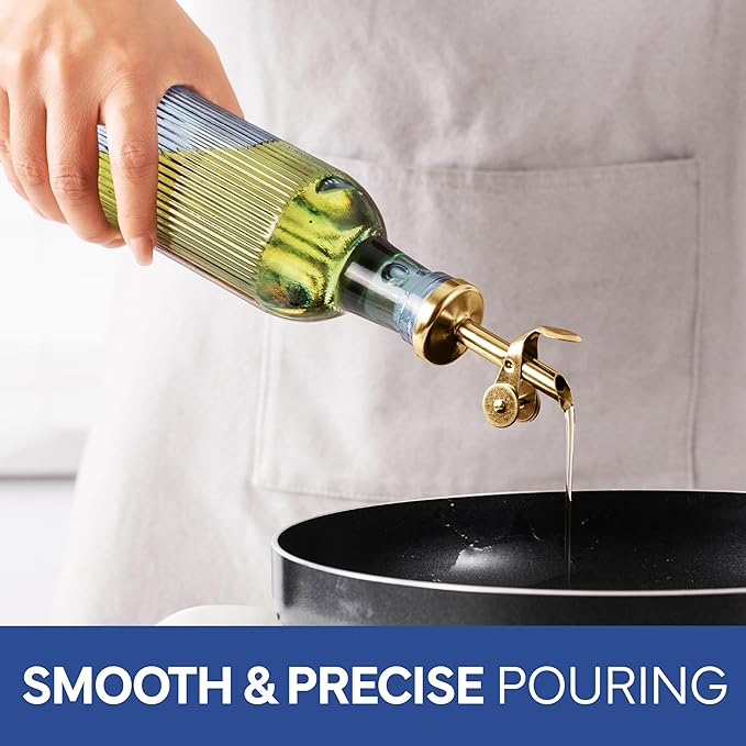 - Beautiful and Functional - Our colored glass oil dispensing bottles, with elegeant colors, gold tops and gold wire rack, will elevate your kitchen. Don't use just any oil bottle, upgrade the way you cook. That's our mission.