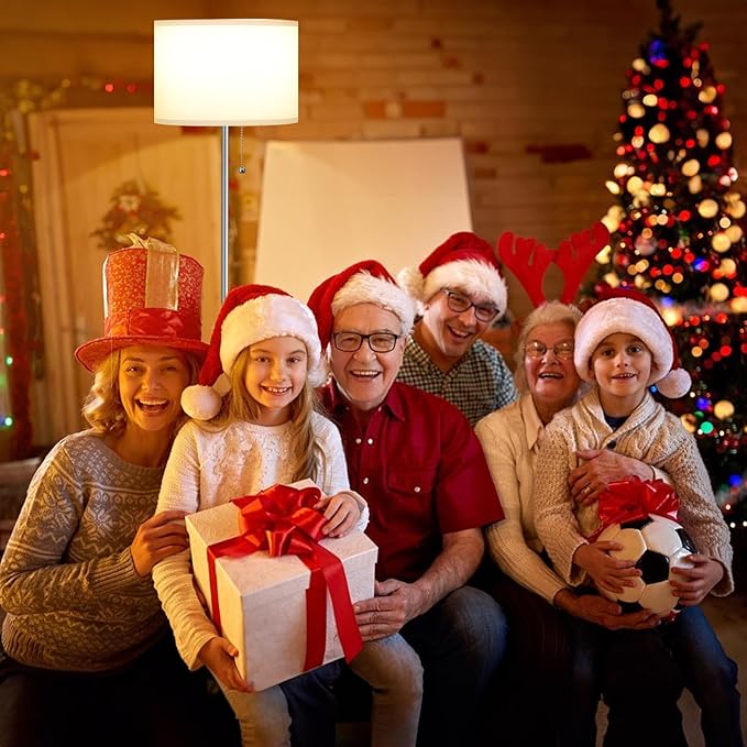 Ambimall Floor Lamps for Living Room with 3 Color Temperatures Bulb & Pull Chain Switch, 60" Modern Standing Floor Lamp for Bedroom Kids Room Study Room(White Shade & Silver Pole)