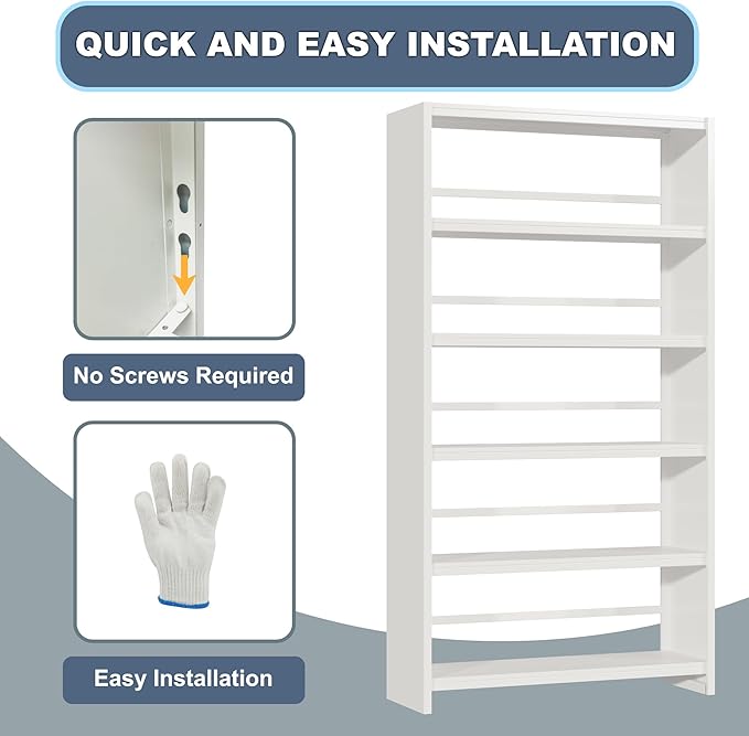 - 【Easy to Assemble】69"H*34"W*11.8"D. The metal bookshelf adopts an upgraded module assembly design. The installation method without screws is simple and easy to operate, and you only need to follow the clear image assembly manual for operation. Moreover, the installation manual has marked all parts, making it easy to assemble. If you have any questions, please get in touch with us and we will provide you with satisfactory service.