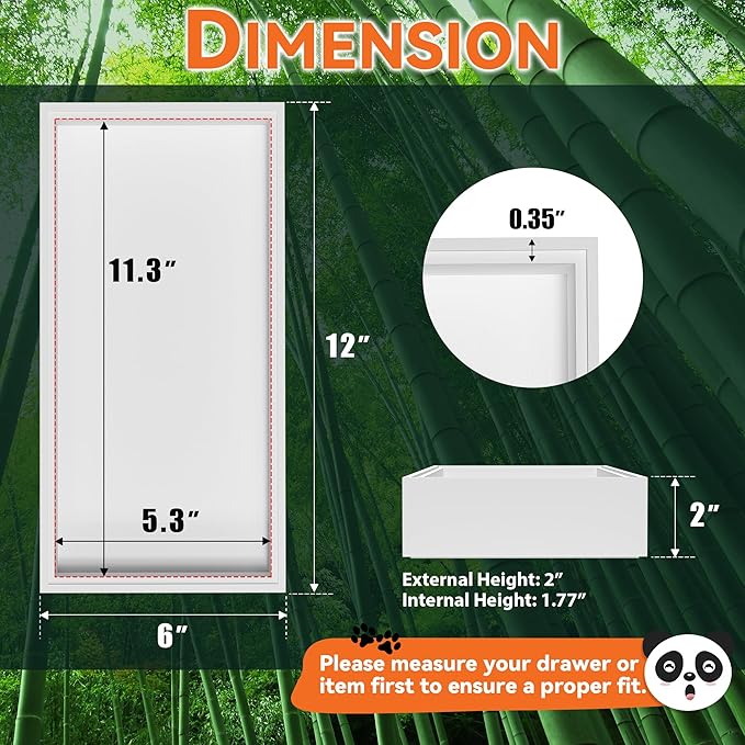 - Each bamboo drawer organizer measures: external size: 12" L x 6" W x 2" H; internal size: 11.3" L x 5.3" W x 1.77" H. Please check the size before purchasing