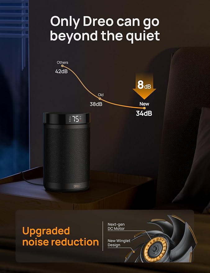 - Cozy quietness: No more choosing between quiet or warmth, Dreo's heater for bedroom warms quietly thanks to its brushless DC motor with frictionless performance and a winglet fan design that reduces turbulence, reducing noise to only 34dB.
